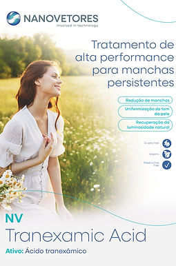 A encapsulação do blend através da tecnologia Nanovetores permite a estabilização de componentes sensíveis e complexos de serem formulados em sua forma livre, conferindo ao NV Tranexamic Acid uma potente ação clareadora, sendo recomendado para o tratamento do melasma e para a prevenção da pigmentação da pele induzida pelos raios UV.